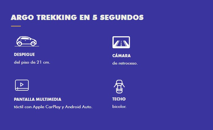 El FIAT Argo Trekking es un hatchback que combina un diseño italiano con una clara vocación aventurera. Su principal característica es su estética off-road, que incluye una suspensión elevada con 21 cm de despeje sobre el suelo, neumáticos de uso mixto y detalles exclusivos como barras de techo, techo en color negro y adhesivos en el capó y laterales. Está impulsado por un motor 1.3L Firefly de 99 CV, acoplado a una transmisión manual de 5 velocidades. En el interior, su equipamiento tecnológico se centra en la pantalla multimedia Uconnect de 7 pulgadas compatible con Android Auto y Apple CarPlay, complementada con cámara de reversa, sensores de estacionamiento y volante multifunción.